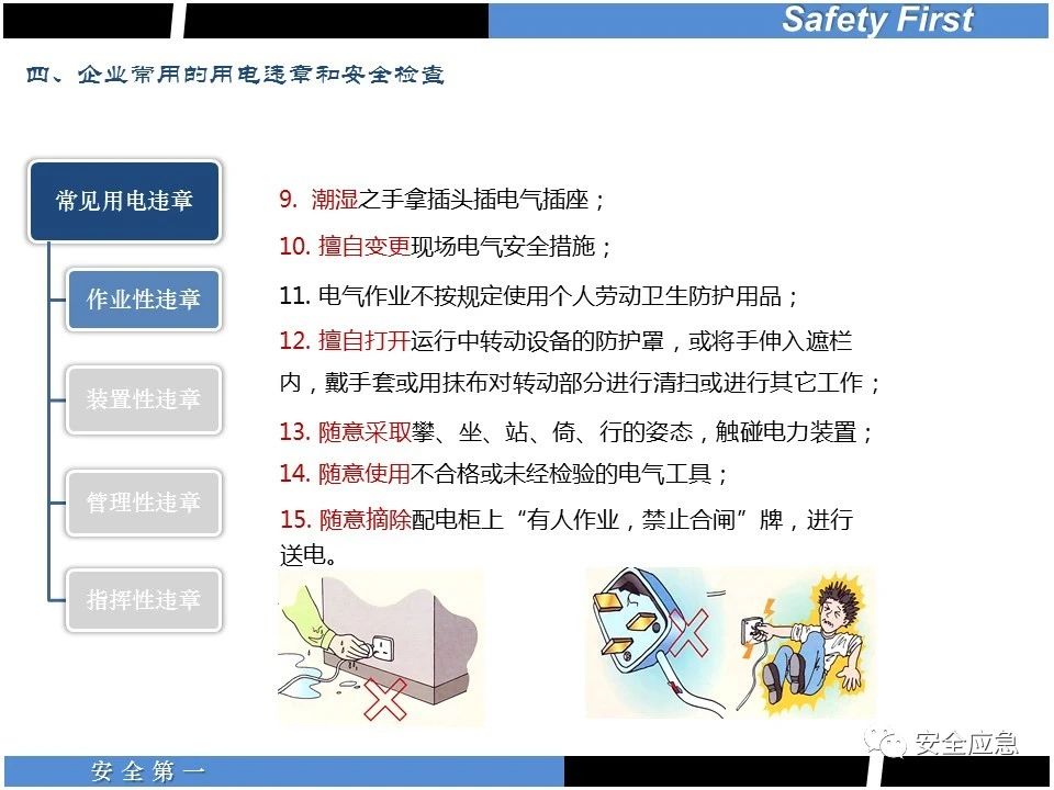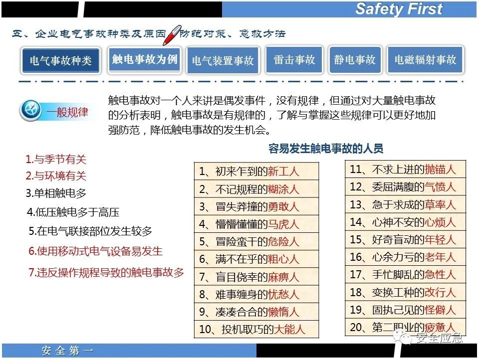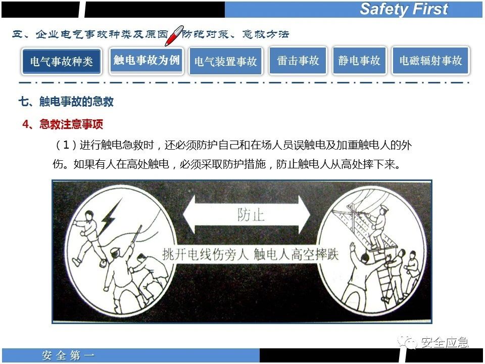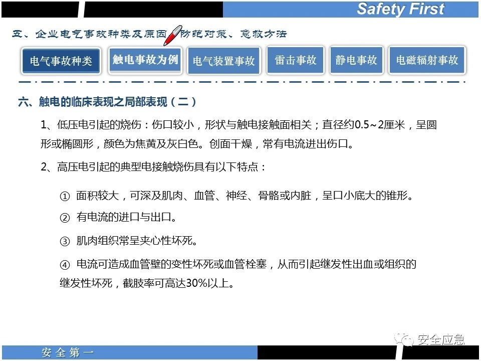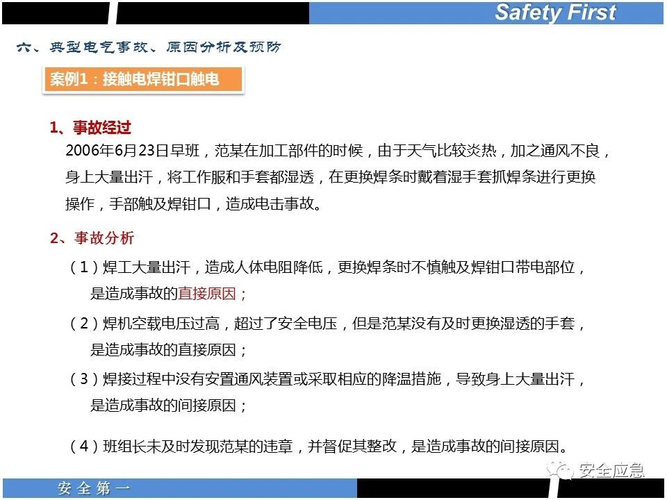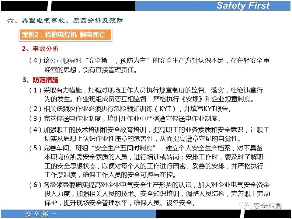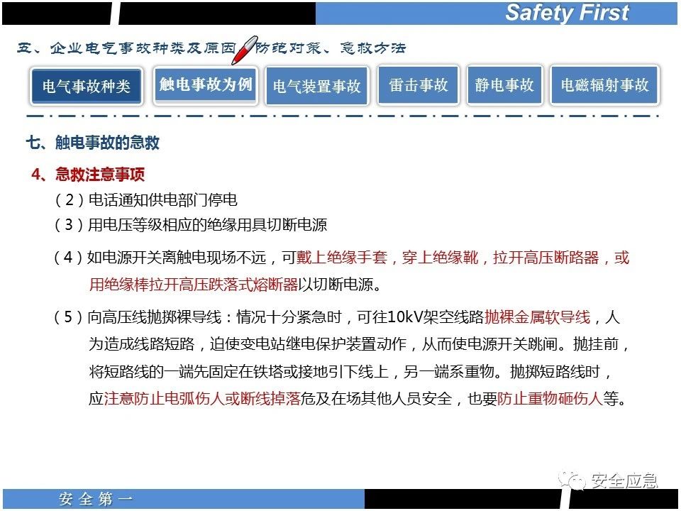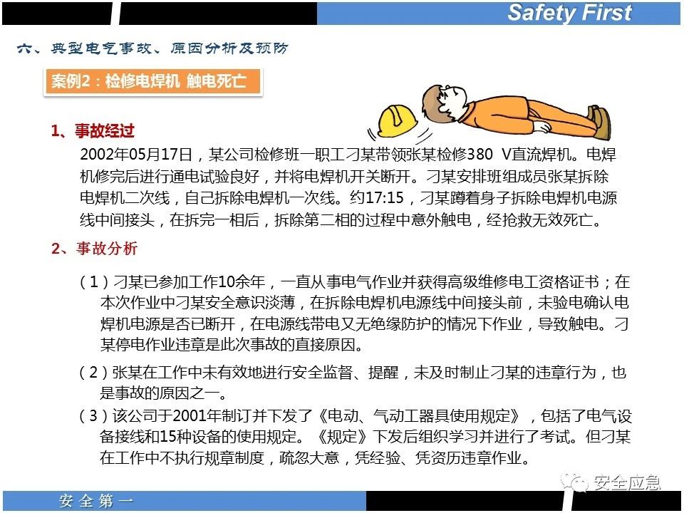 案例73 事故案例73:某35變電站準(zhǔn)備10kV避雷器試驗(yàn)。作業(yè)人員會同運(yùn)行人員準(zhǔn)備查看設(shè)備實(shí)際情況,拆卸10kV開關(guān)柜背板螺栓,打開了柜門上的電磁鎖,并打開了后柜門后,作業(yè)人員探頭進(jìn)入開關(guān)柜內(nèi)時(shí),對開關(guān)柜放電。 其它案例見17、18、19、20、21、22、23、50、52。 (27)多組人員組織混亂 案例74 事故案例74:某單位開展500kV線路停電檢修和地線融冰試驗(yàn)。1名工作人員不聽他人勸阻,登塔拆除引流線。隨后開展地線融冰試驗(yàn),該工作人員觸電死亡。 其它案例見45、46、47、48。 (28)交底不認(rèn)真 案例75 事故案例75:某工作負(fù)責(zé)人帶領(lǐng)兩名工作人員準(zhǔn)備在10kV線路裝設(shè)接地線。工作前,工作負(fù)責(zé)人沒有進(jìn)行班前(后)會,沒有分配工作任務(wù),也沒有交代安全注意事項(xiàng),另外兩人也沒有主動詢問,相互提醒,導(dǎo)致工作負(fù)責(zé)人無監(jiān)護(hù)誤登運(yùn)行線路,造成觸電。 其它案例見32。 (29)監(jiān)護(hù)不到位 l 單人工作無監(jiān)護(hù) 事故案例:36。 l 監(jiān)護(hù)人參與工作 事故案例:11。 l 監(jiān)護(hù)不認(rèn)真,或默許違章行為 事故案例:67。 (30)人員、工作安排不恰當(dāng) 案例76 事故案例76:某供電所安排不具備單獨(dú)工作資格和能力的新入廠員工上桿進(jìn)行配變設(shè)備搶修工作,由于安全距離不夠,員工經(jīng)驗(yàn)不足,監(jiān)護(hù)不到位,導(dǎo)致觸電。 案例77 事故案例77:某高壓試驗(yàn)班開展定檢預(yù)試作業(yè)。工作負(fù)責(zé)人與工作人員在抄錄放電計(jì)數(shù)器銘牌,另一名剛參加工作不久的工作人員拿著自制試驗(yàn)線插入移動電源盤插座內(nèi),然后,用左、右手分別拿住兩個(gè)鱷魚夾準(zhǔn)備對放電器搭接做試驗(yàn),左、右手習(xí)慣性的分別握住了兩個(gè)鱷魚夾的導(dǎo)體部分,此時(shí)電流通過人體,漏電保護(hù)器沒有動作,觸電死亡。 (31)單人作業(yè) l 野外單人巡線、勘察 案例78 事故案例78:某單位開展線路巡視時(shí),單人作業(yè),在被告知“巡視完N58塔后切勿過江,要沿原路返回”的情況下,仍然獨(dú)自一人違規(guī)游泳過江,溺水身亡。 案例79 事故案例79:某單位野外勘察時(shí),某工作人員在未告知工作負(fù)責(zé)人的情況下,獨(dú)自一人返回車輛所在地,途中墜落懸崖暈倒,受輕傷并失蹤12小時(shí)。 附件:最全面的電氣安全培訓(xùn),實(shí)用!