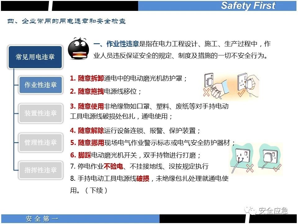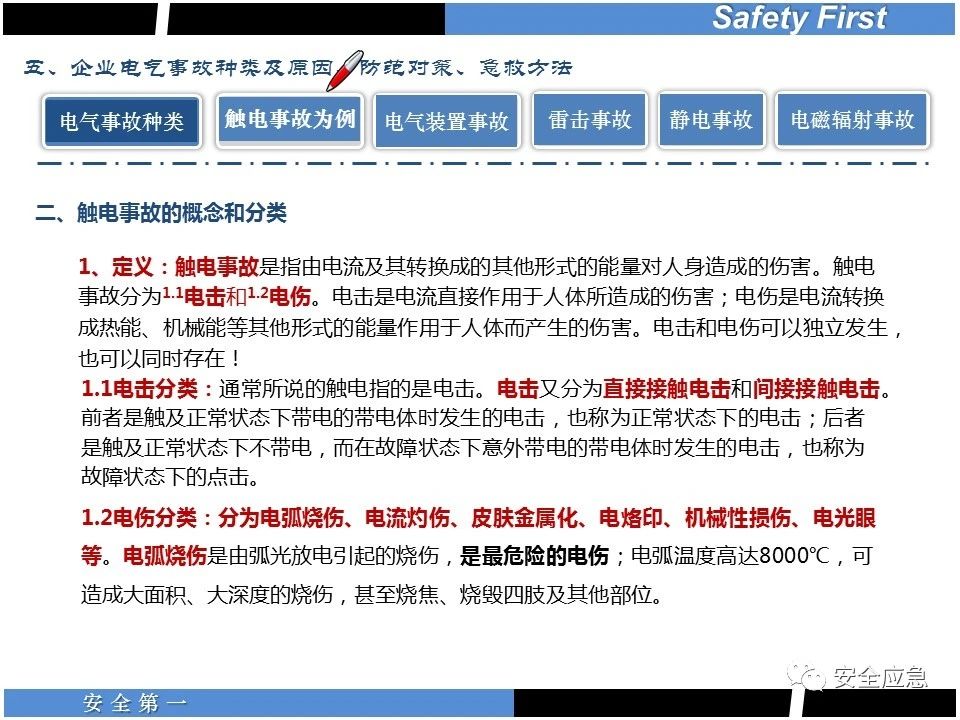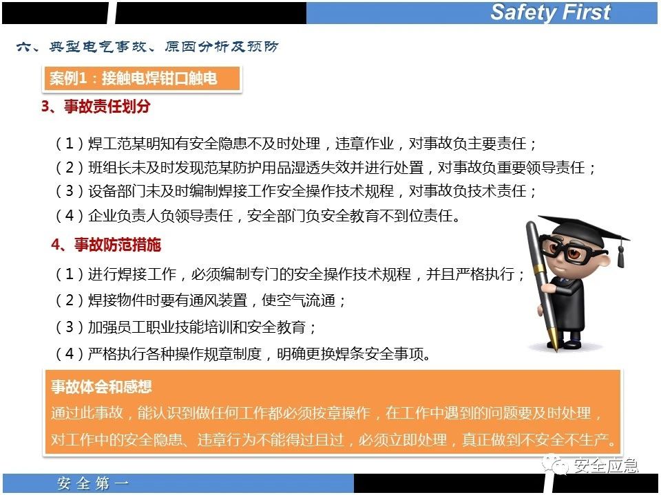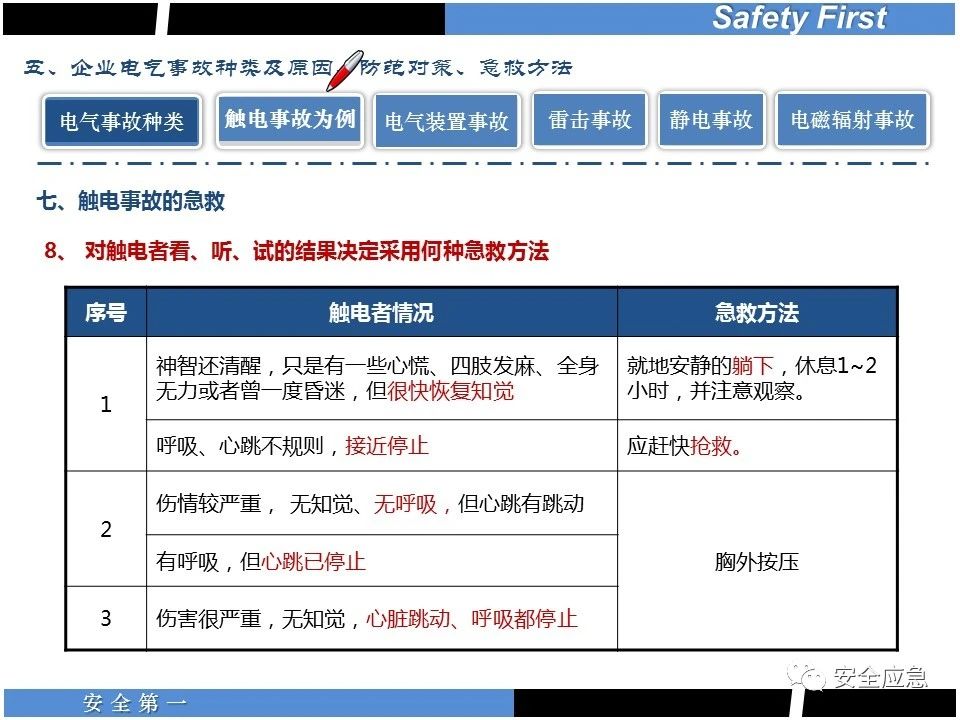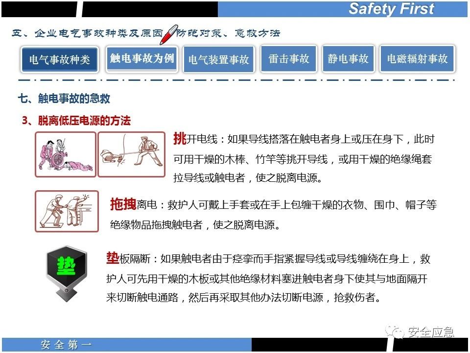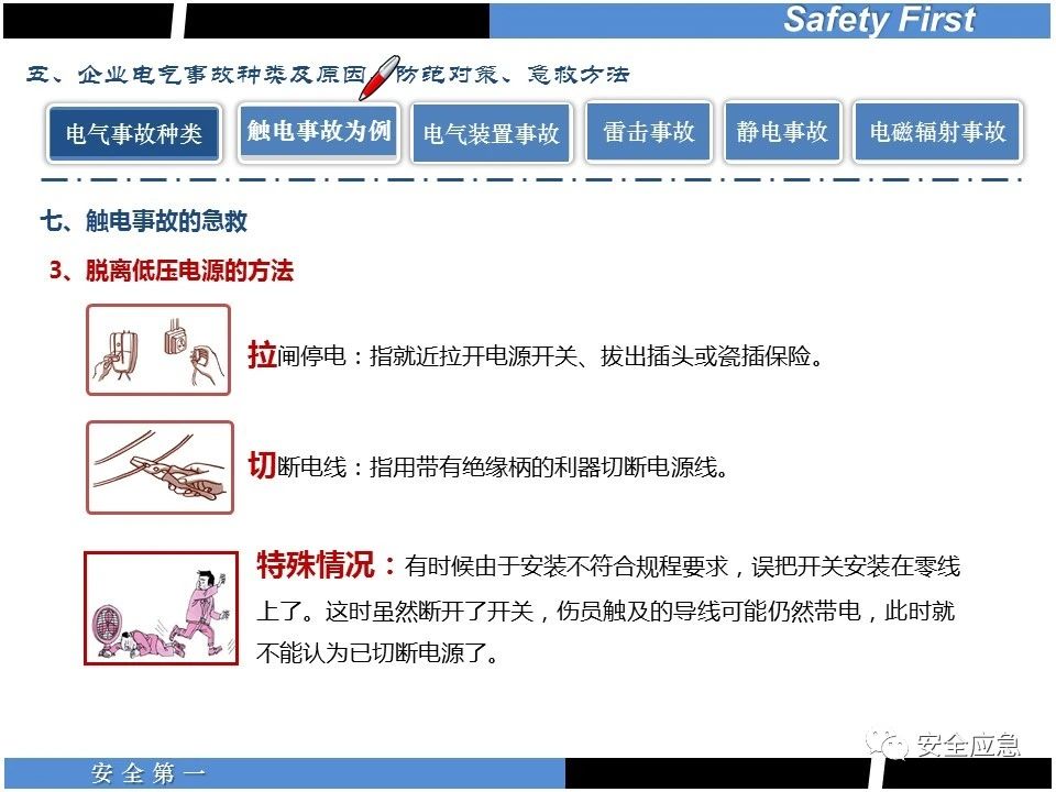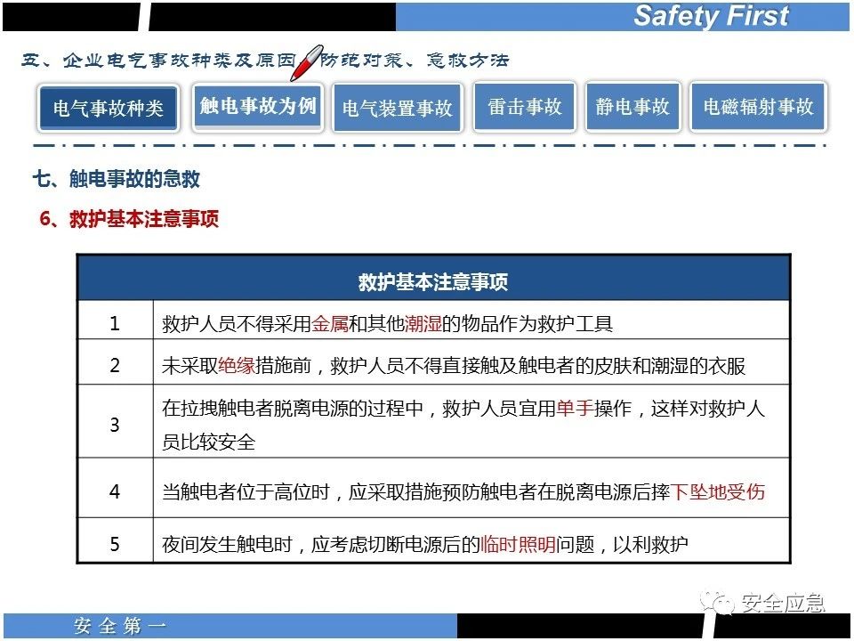 案例73 事故案例73:某35變電站準(zhǔn)備10kV避雷器試驗(yàn)。作業(yè)人員會同運(yùn)行人員準(zhǔn)備查看設(shè)備實(shí)際情況,拆卸10kV開關(guān)柜背板螺栓,打開了柜門上的電磁鎖,并打開了后柜門后,作業(yè)人員探頭進(jìn)入開關(guān)柜內(nèi)時(shí),對開關(guān)柜放電。 其它案例見17、18、19、20、21、22、23、50、52。 (27)多組人員組織混亂 案例74 事故案例74:某單位開展500kV線路停電檢修和地線融冰試驗(yàn)。1名工作人員不聽他人勸阻,登塔拆除引流線。隨后開展地線融冰試驗(yàn),該工作人員觸電死亡。 其它案例見45、46、47、48。 (28)交底不認(rèn)真 案例75 事故案例75:某工作負(fù)責(zé)人帶領(lǐng)兩名工作人員準(zhǔn)備在10kV線路裝設(shè)接地線。工作前,工作負(fù)責(zé)人沒有進(jìn)行班前(后)會,沒有分配工作任務(wù),也沒有交代安全注意事項(xiàng),另外兩人也沒有主動詢問,相互提醒,導(dǎo)致工作負(fù)責(zé)人無監(jiān)護(hù)誤登運(yùn)行線路,造成觸電。 其它案例見32。 (29)監(jiān)護(hù)不到位 l 單人工作無監(jiān)護(hù) 事故案例:36。 l 監(jiān)護(hù)人參與工作 事故案例:11。 l 監(jiān)護(hù)不認(rèn)真,或默許違章行為 事故案例:67。 (30)人員、工作安排不恰當(dāng) 案例76 事故案例76:某供電所安排不具備單獨(dú)工作資格和能力的新入廠員工上桿進(jìn)行配變設(shè)備搶修工作,由于安全距離不夠,員工經(jīng)驗(yàn)不足,監(jiān)護(hù)不到位,導(dǎo)致觸電。 案例77 事故案例77:某高壓試驗(yàn)班開展定檢預(yù)試作業(yè)。工作負(fù)責(zé)人與工作人員在抄錄放電計(jì)數(shù)器銘牌,另一名剛參加工作不久的工作人員拿著自制試驗(yàn)線插入移動電源盤插座內(nèi),然后,用左、右手分別拿住兩個(gè)鱷魚夾準(zhǔn)備對放電器搭接做試驗(yàn),左、右手習(xí)慣性的分別握住了兩個(gè)鱷魚夾的導(dǎo)體部分,此時(shí)電流通過人體,漏電保護(hù)器沒有動作,觸電死亡。 (31)單人作業(yè) l 野外單人巡線、勘察 案例78 事故案例78:某單位開展線路巡視時(shí),單人作業(yè),在被告知“巡視完N58塔后切勿過江,要沿原路返回”的情況下,仍然獨(dú)自一人違規(guī)游泳過江,溺水身亡。 案例79 事故案例79:某單位野外勘察時(shí),某工作人員在未告知工作負(fù)責(zé)人的情況下,獨(dú)自一人返回車輛所在地,途中墜落懸崖暈倒,受輕傷并失蹤12小時(shí)。 附件:最全面的電氣安全培訓(xùn),實(shí)用!