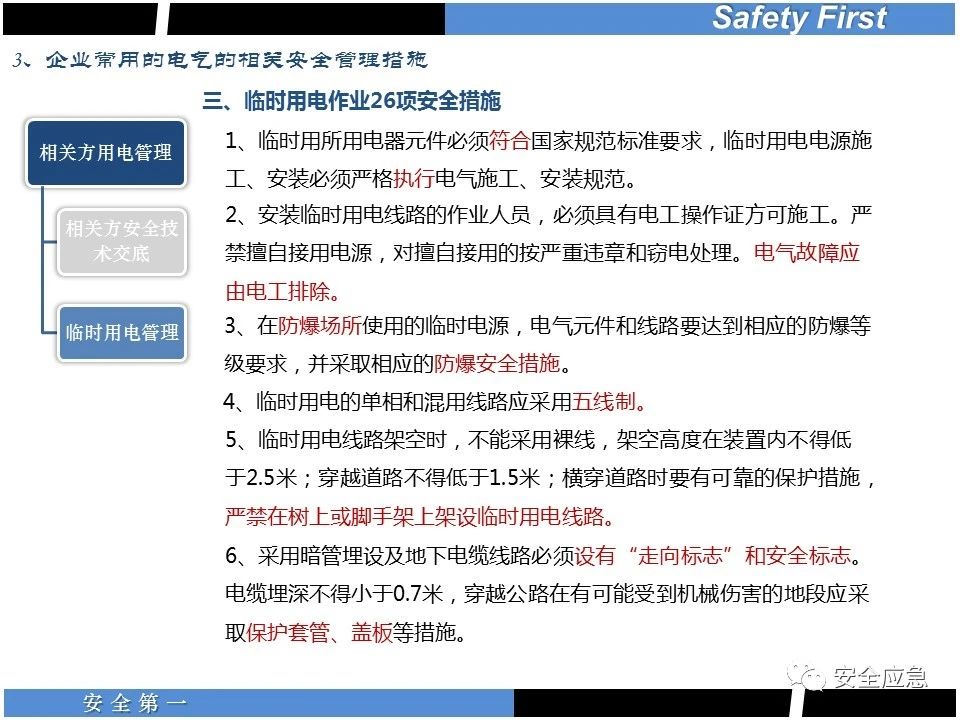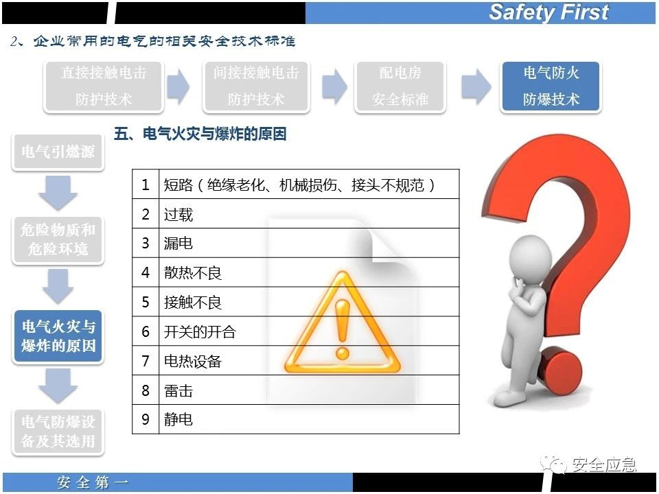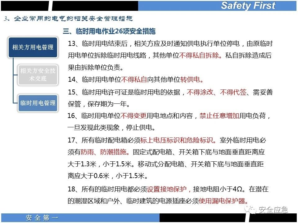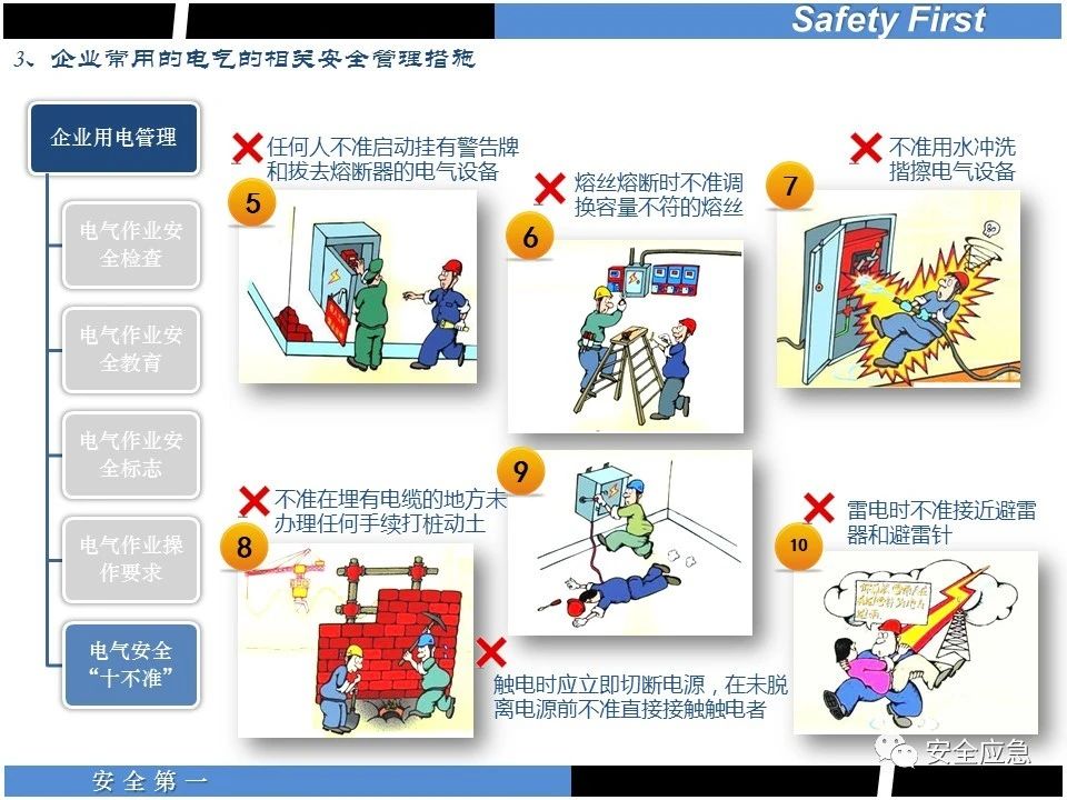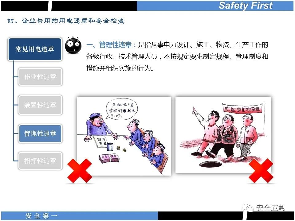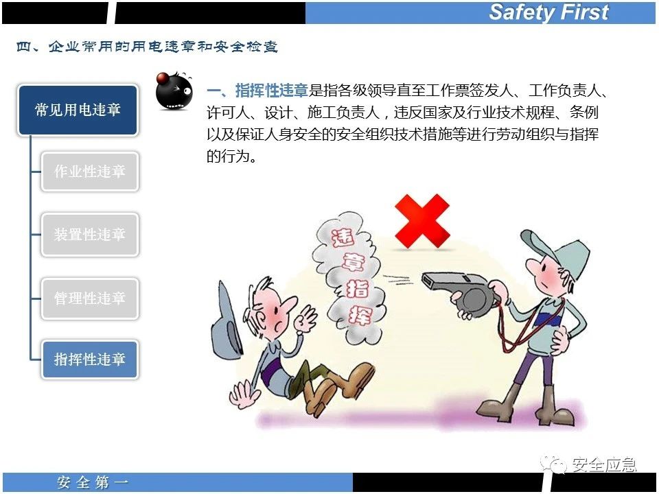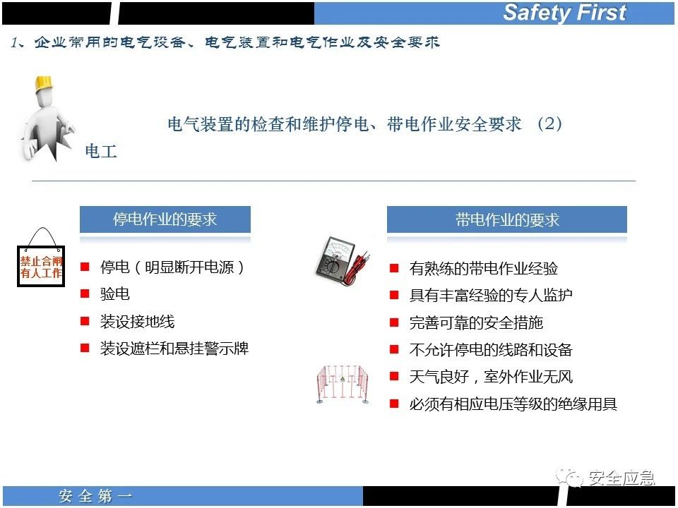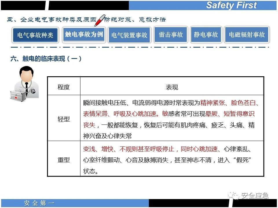 案例73 事故案例73:某35變電站準(zhǔn)備10kV避雷器試驗(yàn)。作業(yè)人員會同運(yùn)行人員準(zhǔn)備查看設(shè)備實(shí)際情況,拆卸10kV開關(guān)柜背板螺栓,打開了柜門上的電磁鎖,并打開了后柜門后,作業(yè)人員探頭進(jìn)入開關(guān)柜內(nèi)時(shí),對開關(guān)柜放電。 其它案例見17、18、19、20、21、22、23、50、52。 (27)多組人員組織混亂 案例74 事故案例74:某單位開展500kV線路停電檢修和地線融冰試驗(yàn)。1名工作人員不聽他人勸阻,登塔拆除引流線。隨后開展地線融冰試驗(yàn),該工作人員觸電死亡。 其它案例見45、46、47、48。 (28)交底不認(rèn)真 案例75 事故案例75:某工作負(fù)責(zé)人帶領(lǐng)兩名工作人員準(zhǔn)備在10kV線路裝設(shè)接地線。工作前,工作負(fù)責(zé)人沒有進(jìn)行班前(后)會,沒有分配工作任務(wù),也沒有交代安全注意事項(xiàng),另外兩人也沒有主動詢問,相互提醒,導(dǎo)致工作負(fù)責(zé)人無監(jiān)護(hù)誤登運(yùn)行線路,造成觸電。 其它案例見32。 (29)監(jiān)護(hù)不到位 l 單人工作無監(jiān)護(hù) 事故案例:36。 l 監(jiān)護(hù)人參與工作 事故案例:11。 l 監(jiān)護(hù)不認(rèn)真,或默許違章行為 事故案例:67。 (30)人員、工作安排不恰當(dāng) 案例76 事故案例76:某供電所安排不具備單獨(dú)工作資格和能力的新入廠員工上桿進(jìn)行配變設(shè)備搶修工作,由于安全距離不夠,員工經(jīng)驗(yàn)不足,監(jiān)護(hù)不到位,導(dǎo)致觸電。 案例77 事故案例77:某高壓試驗(yàn)班開展定檢預(yù)試作業(yè)。工作負(fù)責(zé)人與工作人員在抄錄放電計(jì)數(shù)器銘牌,另一名剛參加工作不久的工作人員拿著自制試驗(yàn)線插入移動電源盤插座內(nèi),然后,用左、右手分別拿住兩個(gè)鱷魚夾準(zhǔn)備對放電器搭接做試驗(yàn),左、右手習(xí)慣性的分別握住了兩個(gè)鱷魚夾的導(dǎo)體部分,此時(shí)電流通過人體,漏電保護(hù)器沒有動作,觸電死亡。 (31)單人作業(yè) l 野外單人巡線、勘察 案例78 事故案例78:某單位開展線路巡視時(shí),單人作業(yè),在被告知“巡視完N58塔后切勿過江,要沿原路返回”的情況下,仍然獨(dú)自一人違規(guī)游泳過江,溺水身亡。 案例79 事故案例79:某單位野外勘察時(shí),某工作人員在未告知工作負(fù)責(zé)人的情況下,獨(dú)自一人返回車輛所在地,途中墜落懸崖暈倒,受輕傷并失蹤12小時(shí)。 附件:最全面的電氣安全培訓(xùn),實(shí)用!