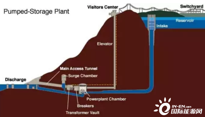 電網(wǎng)低谷時(shí)利用過剩電力將作為液態(tài)能量媒體的水從低標(biāo)高的水庫抽到高標(biāo)高的水庫,電網(wǎng)峰荷時(shí)高標(biāo)高水庫中的水回流到下水庫推動(dòng)水輪機(jī)發(fā)電機(jī)發(fā)電。