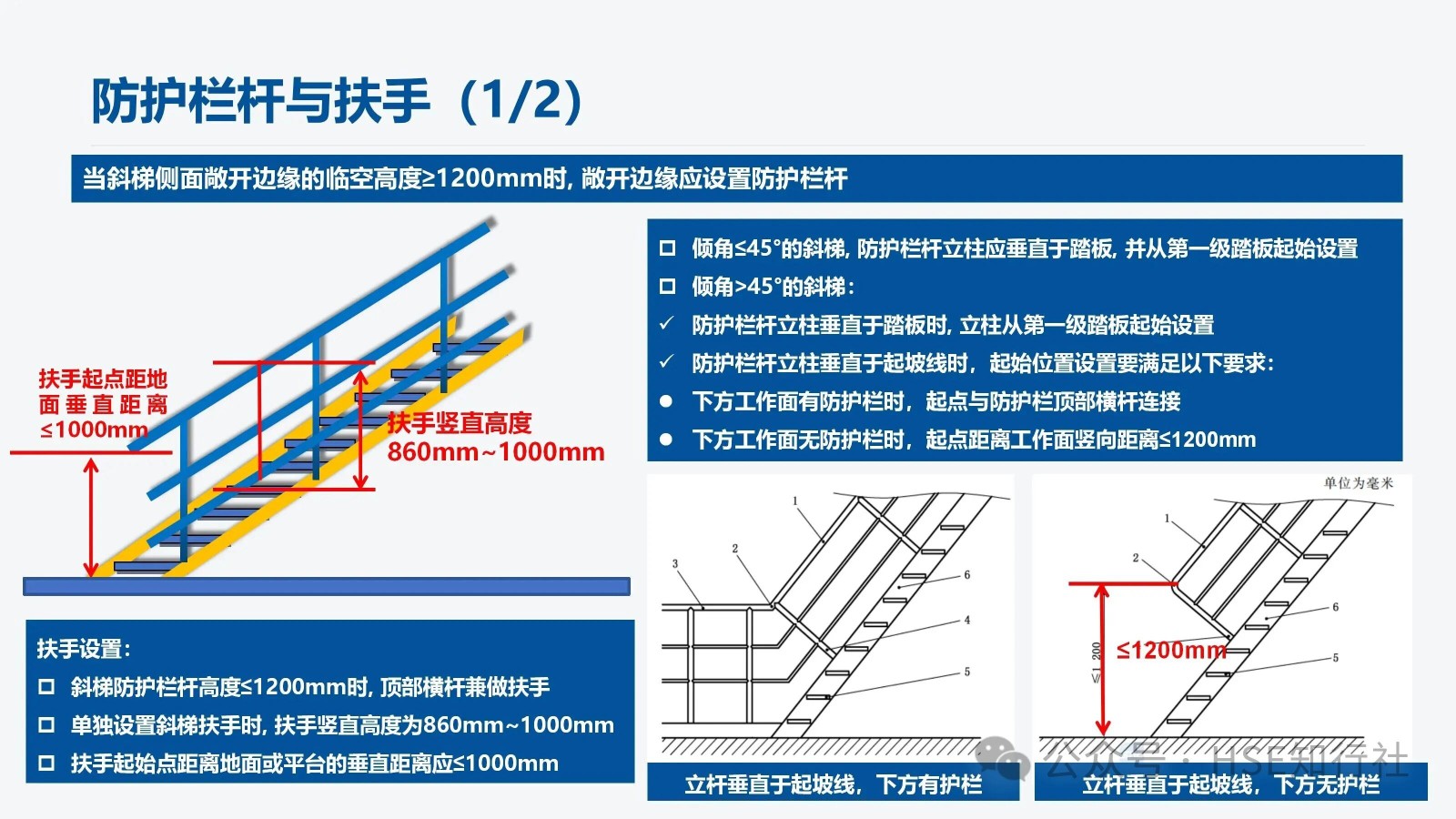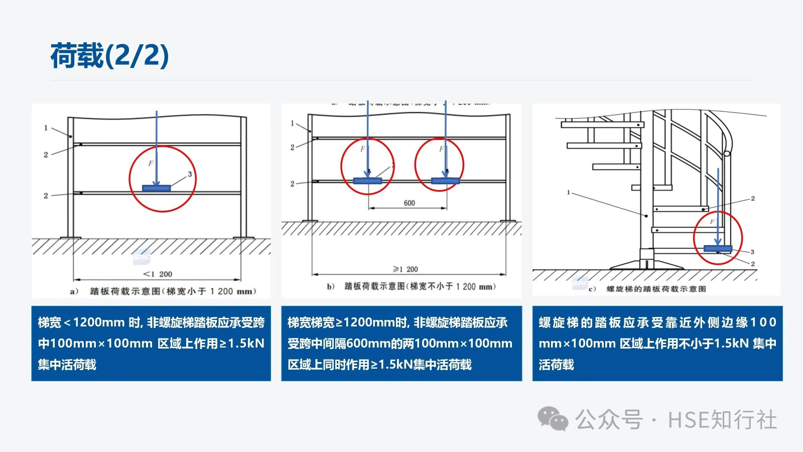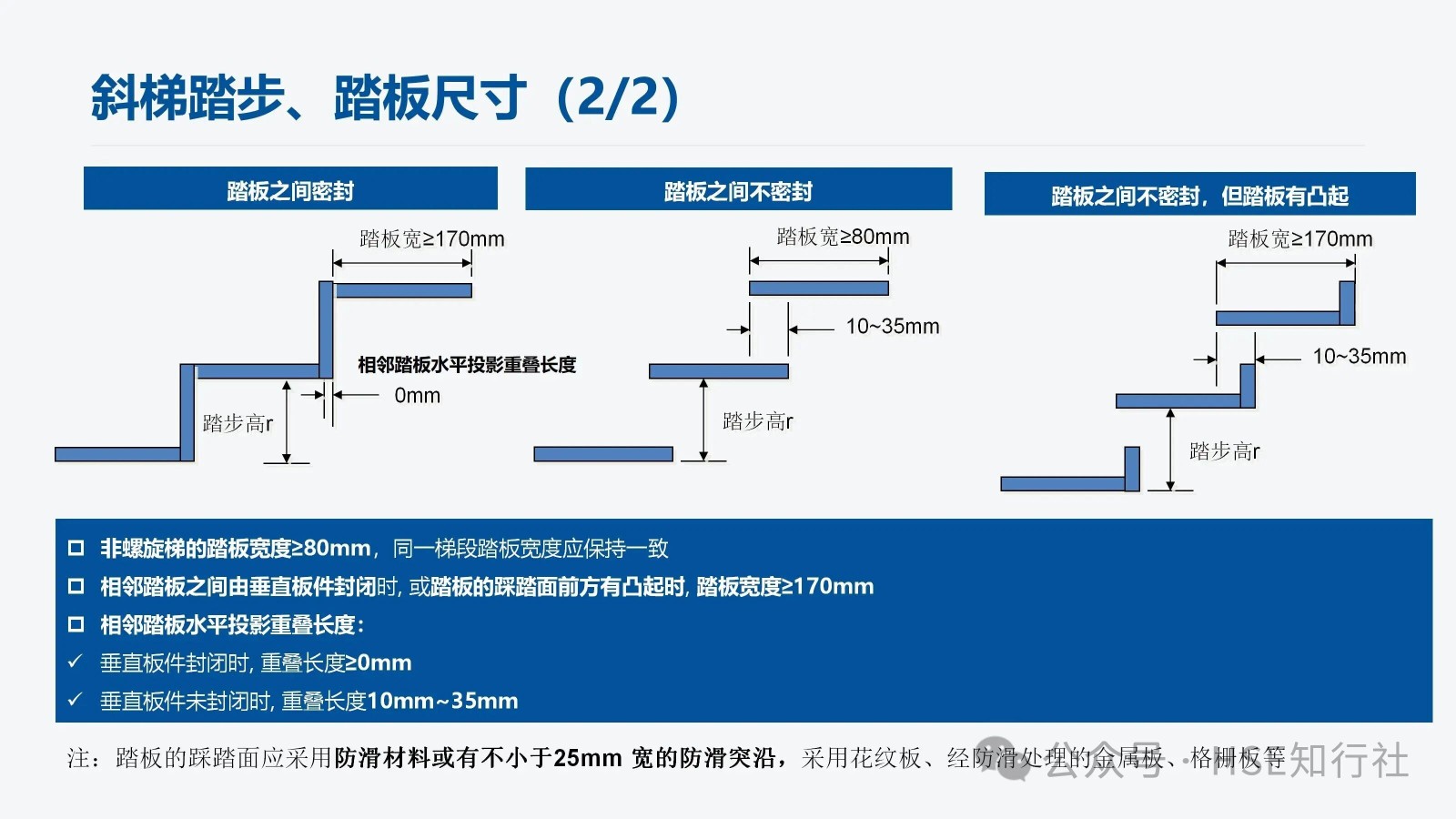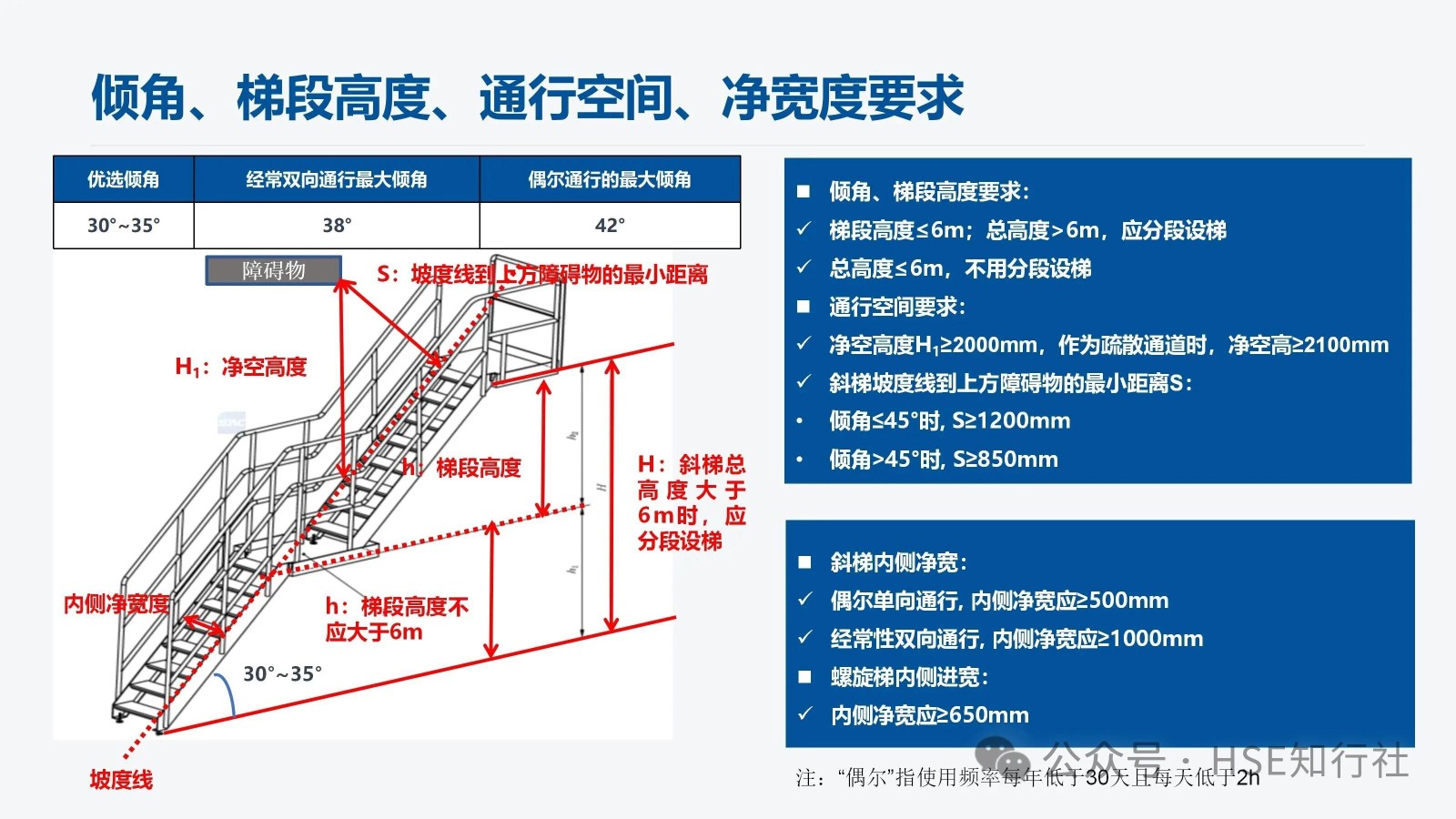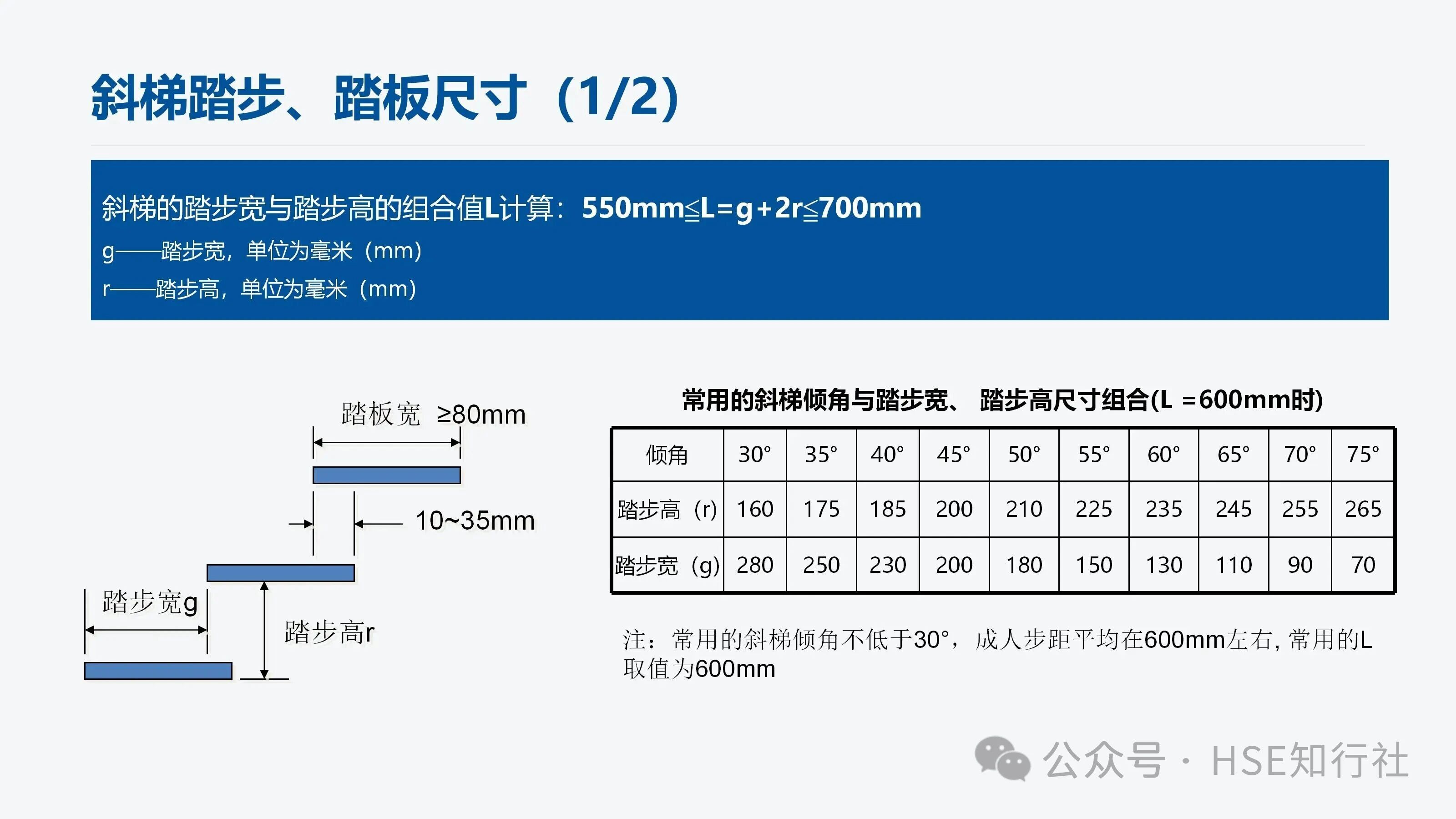 適用范圍 適用于工業(yè)企業(yè)內(nèi)工作場所中使用的固定式金屬斜梯的設(shè)計、制造和安裝。不適用于安裝在核設(shè)施、船舶、 起重機械、輸電塔上的固定式金屬斜梯。 傾角、梯段高度、通行空間、凈寬度要求 傾角、梯段高度要求: 梯段高度≤6m;總高度>6m,應(yīng)分段設(shè)梯。 總高度≤6m,不用分段設(shè)梯。 通行空間要求: 凈空高度:H1≥2000mm,作為疏散通道時,凈空高≥2100mm 斜梯坡度線到上方障礙物的最小距離S: 傾角≤45°時, S≥1200mm 傾角>45°時, S≥850mm 斜梯內(nèi)側(cè)凈寬: 偶爾單向通行, 內(nèi)側(cè)凈寬應(yīng)≥500mm 經(jīng)常性雙向通行, 內(nèi)側(cè)凈寬應(yīng)≥1000mm 螺旋梯內(nèi)側(cè)進(jìn)寬: 內(nèi)側(cè)凈寬應(yīng)≥650mm 注:“偶爾”指使用頻率每年低于30天且每天低于2h。 傾角要求: 優(yōu)選傾角:30°~35° 經(jīng)常雙向通行最大傾角:38° 偶爾通行的最大傾角:42° 斜梯踏步、踏板尺寸 平臺設(shè)置要求: 1、斜梯的踏步寬與踏步高的組合值L計算: 550mm≦L=g+2r≦700mm g——踏步寬,單位為毫米(mm) r——踏步高,單位為毫米(mm) 2、常用的斜梯傾角與踏步寬、踏步高尺寸組合(L =600mm時): 傾角 30° 35° 40° 45° 50° 55° 60° 65° 70° 75° 踏步高(r) 160 175 185 200 210 225 235 245 255 265 踏步寬(g) 280 250 230 200 180 150 130 110 90 70 注:常用的斜梯傾角不低于30°,成人步距平均在600mm左右, 常用的L取值為600mm。 3、不同踏板形式的踏板寬度、相鄰踏板水平投影長度也不相同,具體如下: 踏板之間封閉: 踏板之間不封閉: 踏板之間不封閉,但踏板有凸起: 非螺旋梯的踏板寬度≥80mm,同一梯段踏板寬度應(yīng)保持一致。 相鄰踏板之間由垂直板件封閉時, 或踏板的踩踏面前方有凸起時, 踏板寬度≥170mm。 相鄰踏板水平投影重疊長度: 1、垂直板件封閉時, 重疊長度≥0mm 2、垂直板件未封閉時, 重疊長度10mm~35mm 注:踏板的踩踏面應(yīng)采用防滑材料或有不小于25mm 寬的防滑突沿,采用花紋板、經(jīng)防滑處理的金屬板、格柵板等。 螺旋梯踏步、踏板尺寸 距離螺旋梯扇形踏步窄邊300mm處的踏步寬應(yīng)不小于170mm。 螺旋梯的踏步高應(yīng)在160mm~240mm范圍內(nèi)。 螺旋梯同一梯段踏板的平面投影圓心角應(yīng)保持一致(梯段頂部踏板除外)。 防護欄桿與扶手 防護欄桿設(shè)置: 當(dāng)斜梯側(cè)面敞開邊緣的臨空高度≥1200mm時, 敞開邊緣應(yīng)設(shè)置防護欄桿。 傾角≤45°的斜梯, 防護欄桿立柱應(yīng)垂直于踏板, 并從第一級踏板起始設(shè)置。 傾角>45°的斜梯: 1、防護欄桿立柱垂直于踏板時, 立柱從第一級踏板起始設(shè)置。 2、防護欄桿立柱垂直于起坡線時,起始位置設(shè)置要滿足以下要求: 下方工作面有防護欄時,起點與防護欄頂部橫桿連接。 下方工作面無防護欄時,起點距離工作面豎向距離≤1200mm。 立桿垂直于起坡線,下方有護欄 立桿垂直于起坡線,下方無護欄 扶手設(shè)置: 扶手設(shè)置主要根據(jù)斜梯的傾角、斜梯的梯寬來設(shè)置,設(shè)置要求如下圖: 斜梯防護欄桿高度≤1200mm時, 頂部橫桿兼做扶手。 單獨設(shè)置斜梯扶手時, 扶手豎直高度為860mm~1000mm。 扶手起始點距離地面或平臺的垂直距離應(yīng)≤1000mm。 梯間平臺與門 梯間平臺: 1、梯間平臺寬度應(yīng)不小于梯子寬度, 對斜梯應(yīng)不小于760mm 。 2、梯間平臺在行進(jìn)方向上的長度應(yīng)不小于梯子寬度, 對斜梯應(yīng)不小于850mm。 3、梯間平臺要符合GB4053.3—2025的規(guī)定。 自閉門: 1、自行關(guān)閉、保持在關(guān)閉位置但不鎖定。 2、采用平開方式向平臺內(nèi)打開、打開角度不小于 90°。 3、關(guān)閉時由擋塊阻擋,防止人員推開發(fā)生墜落或其他意外傷害。 4、不設(shè)置踢腳板、底部距離平臺高度為120mm~500mm。 5、自閉門要符合GB4053.3—2025的規(guī)定。 荷載 梯梁、踏板、頂部橫桿、中間桿、立柱荷載如下: 1、梯寬<1200mm 時, 非螺旋梯踏板應(yīng)承受跨中100mm×100mm 區(qū)域上作用≥1.5kN集中活荷載。 2、梯寬梯寬≥1200mm時, 非螺旋梯踏板應(yīng)承受跨中間隔600mm的兩100mm×100mm區(qū)域上同時作用≥1.5kN集中活荷載。 3、螺旋梯的踏板應(yīng)承受靠近外側(cè)邊緣100 mm×100mm 區(qū)域上作用不小于1.5kN 集中活荷載。 使用說明和警示信息 斜梯的使用說明和警示信息,主要從“斜梯的使用說明”、“斜梯的警示信息”、“自閉門的警示信息”三方面來完善,同時涉及到的安全色和安全標(biāo)志應(yīng)符合 GB2894 的規(guī)定。 1、斜梯的使用說明,包括但不限以下內(nèi)容: a) 斜梯、平臺的最大允許荷載.。 b) 自閉門的安全使用信息。 c) 維護和檢查的要求。 需要設(shè)計、制造方提供使用說明。 2、斜梯的警示信息,包括但不限以下內(nèi)容: a)最大荷載信息(包括允許的最大負(fù)載人數(shù)、工具和裝備等最大附加荷載)。 b)人員攀登時的安全要求(例如當(dāng)心墜落、必須戴安全帽等)。 3、自閉門的警示信息,包括但不限以下內(nèi)容: a)禁止倚靠的信息。 b)小心墜落的信息。 c) 提示非通行狀態(tài)保持關(guān)閉。