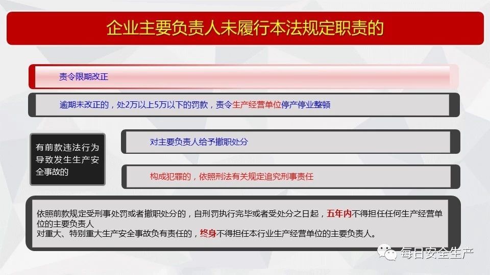 組織機(jī)構(gòu)和職責(zé) | 主要負(fù)責(zé)人未履行安全生產(chǎn)管理職責(zé)的 | 責(zé)令限期改正 | 對(duì)主要負(fù)責(zé)人處二萬元以上五萬元以下的罰款,責(zé)令生產(chǎn)經(jīng)營單位停產(chǎn)停業(yè)整頓。 |