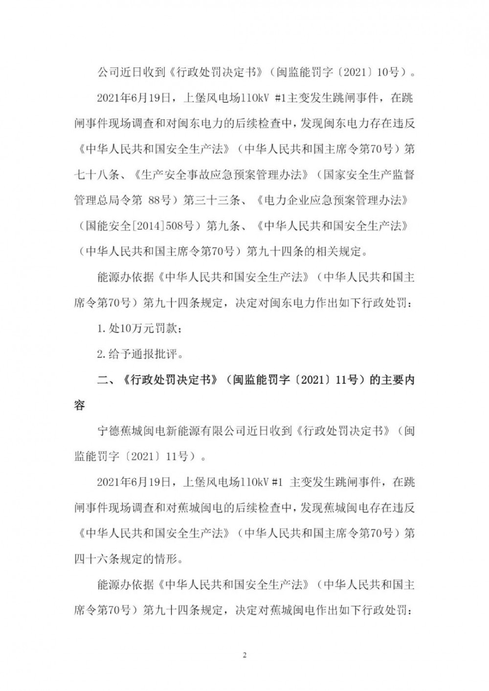 《公告》顯示,2021年6月19日,因上堡風電場110kV#1主變發(fā)生跳閘事件,在跳閘事件現(xiàn)場調查和對閩東電力的后續(xù)檢查中,發(fā)現(xiàn)閩東電力、蕉城閩電、環(huán)三億能均存在違反相關法律條文的情況,分別處以10萬元、5萬元、5萬元的罰款。
