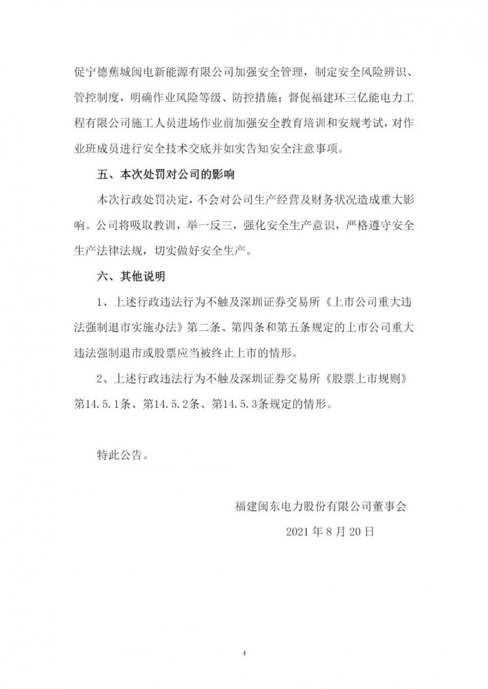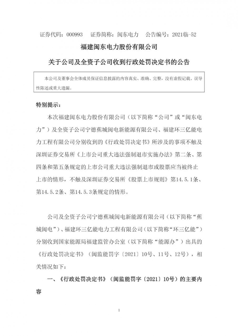 近日,福建閩東電力股份有限公司(以下簡稱“閩東電力”)向社會公眾披露了《關于公司及全資子公司收到行政處罰決定書的公告》,閩東電力及旗下全資子公司寧德蕉城閩電新能源有限責任公司(以下簡稱“蕉城閩電”)、福建環(huán)三億能電力工程有限公司(以下簡稱“環(huán)三億能”)分別收到國家能源局福建監(jiān)管辦公室簽發(fā)的《行政處罰決定書》。