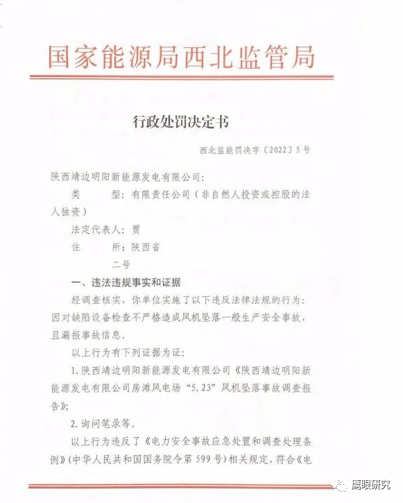 3月18日,國家能源局西北監(jiān)管局發(fā)布對陜西靖邊明陽新能源發(fā)電有限公司的行政處罰決定書(西北監(jiān)能罰決字〔2022〕5號),該公司因?qū)θ毕菰O(shè)備檢查不嚴(yán)格造成風(fēng)機(jī)墜落一般生產(chǎn)安全事故,且漏報事故信息,對其作出罰款10萬元的決定。