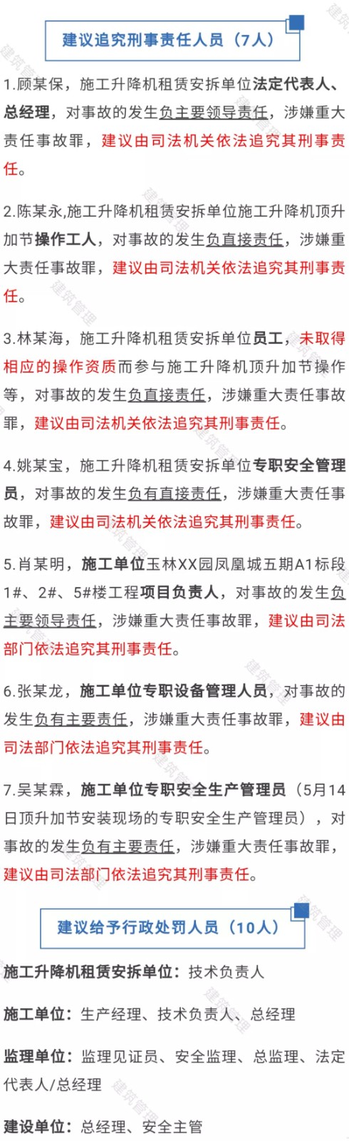 玉林升降機(jī)墜落致6人死亡!項(xiàng)目負(fù)責(zé)人安全員等7人被追刑責(zé)!10人被處罰!調(diào)查報(bào)告公布