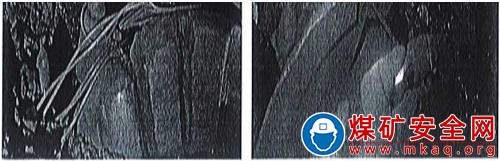 采煤機(jī)前滾筒在工作面中間巷巷口中部,外露部分有7處損壞截齒座和截齒;后滾筒在溜尾方向距中間巷10m處,后滾筒上纏繞有錨索(見圖4)。