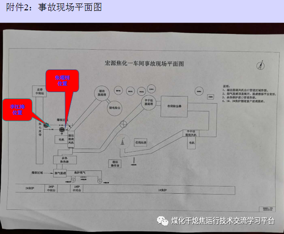 根據(jù)焦爐煙道氣脫硫脫硝系統(tǒng)配電室引風機變頻器的運行記錄顯示,9月8日8時54分左右山西省襄汾縣宏源煤焦化工有限公司一車間焦爐煙道氣濕法脫硫系統(tǒng)引風機停止運行,9時04分左右工段長張耀剛安排操作工董副紅在電腦上啟動引風機,自己去引風機處觀察情況,隨后在對講機中通知董副紅引風機已啟動,要求提高轉速。操作工董副紅聽到指令后進行加速, 9時06分左右引風機出口處管道發(fā)生爆炸;董副紅在對講機中聽到有人喊停風機,于是他就在電腦上進行了停止引風機運行操作,隨后撤離到安全地帶,但此時引風機并未停止運行。大約9時22分左右,脫硝反應器又發(fā)生爆炸,造成脫硝反應器及周邊設備設施嚴重損壞;9時31分由電氣主任王斌電話通知配電室值班電工斷開煙道氣濕法脫硫引風機電源停引風機?,F(xiàn)場發(fā)生爆炸后,一車間經(jīng)理祁建軍、生產(chǎn)部長張建飛、煉焦副主任雷敬禹先后趕到引風機處檢查,在引風機北側發(fā)現(xiàn)張耀剛躺在地上,隨即將張耀剛抬至路邊,然后通知救護車,9時56分左右將張耀剛送至醫(yī)院進行救護?,F(xiàn)場人員全部撤離,在清點人數(shù)時發(fā)現(xiàn)設備主任李江濤找不見且聯(lián)系不上,張建飛帶領員工再次進入現(xiàn)場進行搜尋,在引風機西北側焦7皮帶走廊外墻根處的一塊爆炸飛出的管道鋼板下發(fā)現(xiàn)了李江濤,11時44分左右將李江濤送往醫(yī)院搶救。以上兩名傷者均搶救無效死亡。