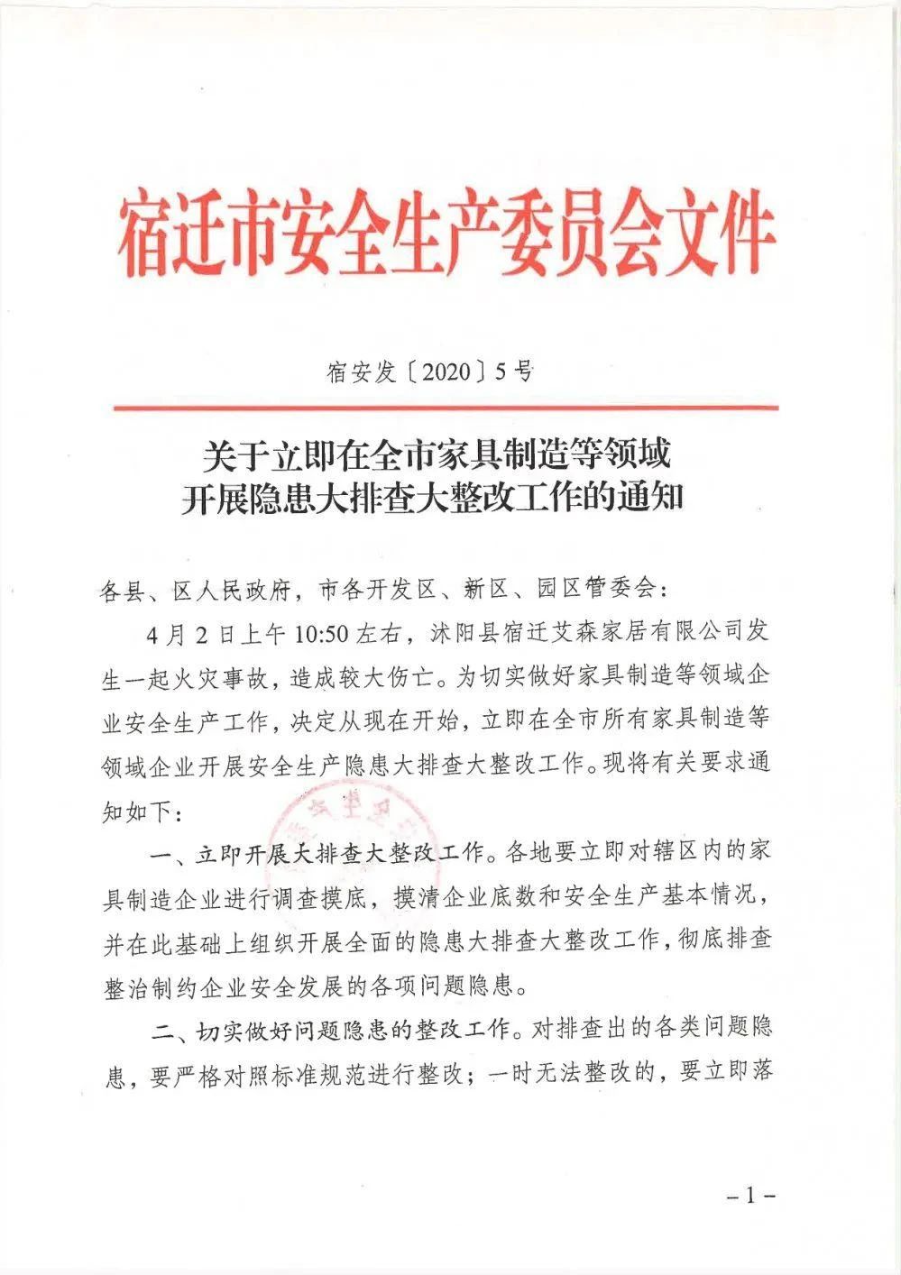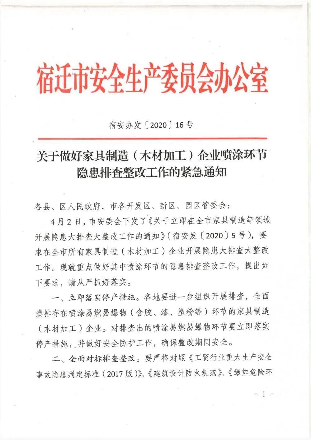 宿遷安監(jiān)消息:近日,宿遷市安委會連續(xù)發(fā)出5號、6號文件,安委辦發(fā)出16號文件,要求開展專項治理。安委辦16號文件特別提出要重點(diǎn)做好家具制造噴涂環(huán)節(jié)的隱患排查整改工作。