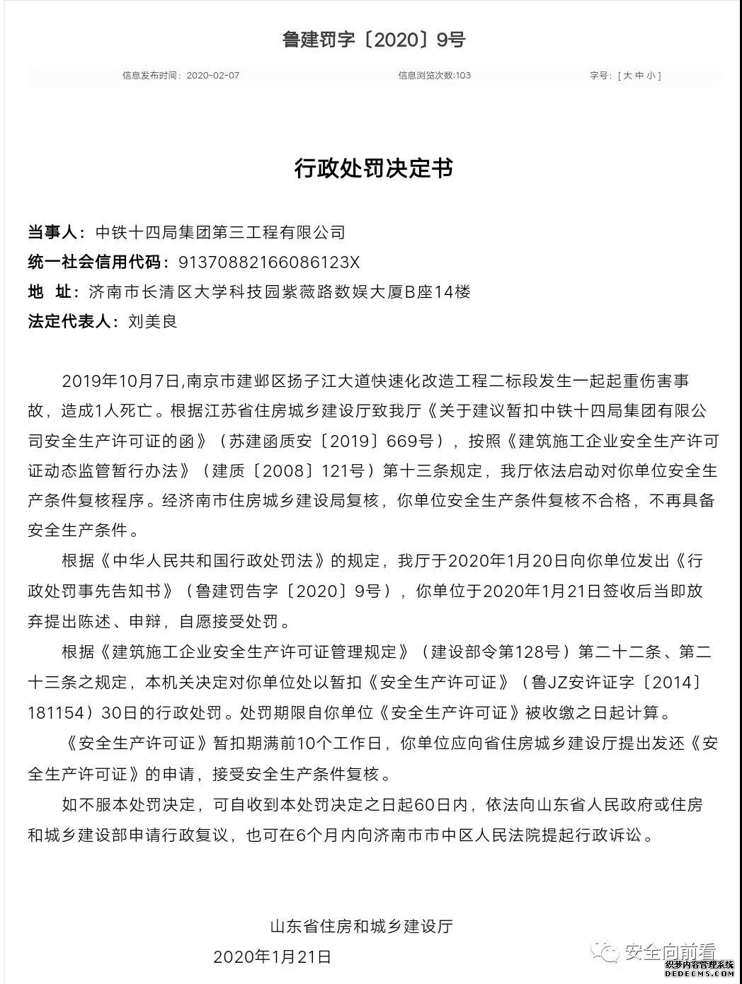 省住房城鄉(xiāng)建設廳魯建罰字〔2020〕9號行政處罰決定書顯示,2019年10月7日,南京市建鄴區(qū)揚子江大道快速化改造工程二標段發(fā)生一起起重傷害事故,造成1人死亡。根據(jù)江蘇省住房城鄉(xiāng)建設廳致我廳《關于建議暫扣中鐵十四局集團有限公司安全生產許可證的函》(蘇建函質安〔2019〕669號),按照《建筑施工企業(yè)安全生產許可證動態(tài)監(jiān)管暫行辦法》(建質〔2008〕121號)第十三條規(guī)定,我廳依法啟動對中鐵十四局三公司安全生產條件復核程序。