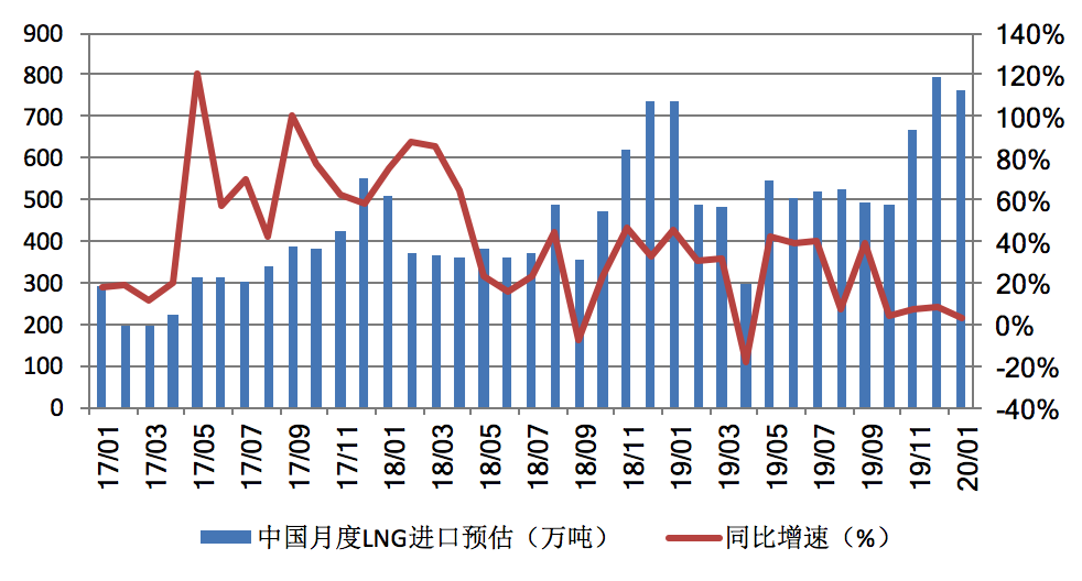 新華能源E-gas數(shù)據(jù)平臺(tái)的預(yù)測(cè)結(jié)果顯示,2020年1月份,中國(guó)LNG進(jìn)口量預(yù)計(jì)為763萬噸,較去年同期增長(zhǎng)3.4%,較2019年12月減少3.9%。