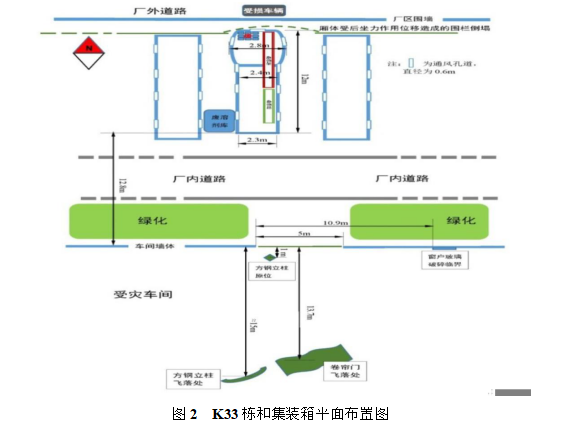 在廠區(qū)的平面布置見圖 1,K33 棟和集裝箱周邊環(huán)境情況見