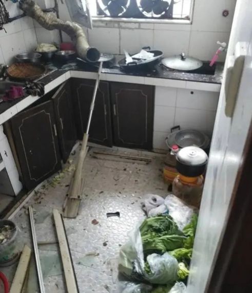 趕緊跑進(jìn)廚房查看,發(fā)現(xiàn)灶上的高壓鍋發(fā)生爆炸。廚房里的灶臺(tái)、櫥柜、排煙管皆被震碎,現(xiàn)場(chǎng)一片狼藉,