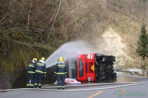 消防隊(duì)員10時(shí)48分到達(dá)現(xiàn)場,偵查發(fā)現(xiàn)天然氣槽車側(cè)翻在道路靠山體一旁。經(jīng)偵察,事故車輛為一輛裝載22噸液化天然氣槽罐車側(cè)翻,事故發(fā)生后車內(nèi)兩名司乘人員自行撤離出,身體并無大礙,車輛罐體表面無破損,未發(fā)生泄漏。
