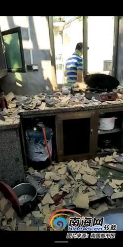 記者在當?shù)鼐用裉峁┑囊欢我曨l中看到,發(fā)生爆炸的廚房為一間瓦房,屋內(nèi)有灶臺和一張圓桌,煤氣罐放在灶臺下方。煤氣罐上方的屋頂被沖擊波轟開,玻璃窗全被震碎,屋內(nèi)散落著碎瓦片和玻璃渣,原本放在桌上的餐具散落一地。廚房門口上方墻體出現(xiàn)半米長的裂縫,震裂脫落的木門被炸飛出房門外約1米的地上,屋外的水桶等雜物也被震倒。