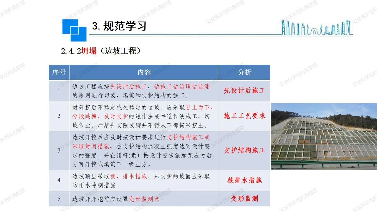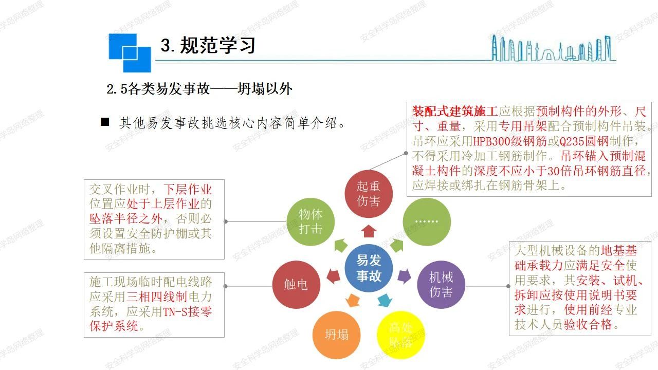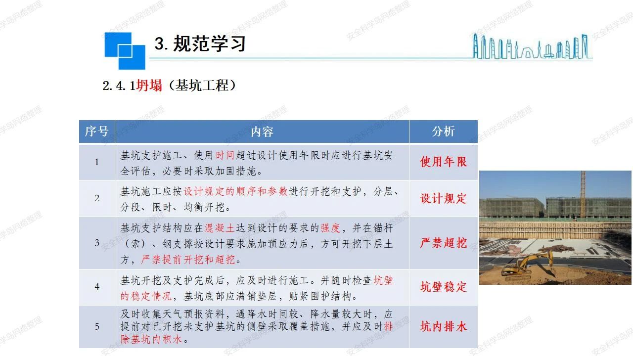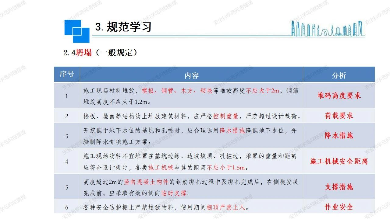 那么,坍塌事故發(fā)生的原因何在? (1)工程結(jié)構(gòu)設(shè)計不合理或計算失誤。 (2)施工前沒有編制切實可行的施工組織設(shè)計和專項施工方案,未做具體技術(shù)安全措施交底,特定施工項目未經(jīng)專家評審論證。 (3)腳手架、模板支撐、起重設(shè)備結(jié)構(gòu)設(shè)計不合理或計算失誤。 (4)建筑物結(jié)構(gòu)質(zhì)量低劣,安全性能差,地基不穩(wěn)定,不均勻沉降。 (5)建筑物結(jié)構(gòu)支撐連接(焊接)不牢固,超載、外力沖擊或嚴重偏心載荷造成失穩(wěn)等。 (6)腳手架及高大模板支架架體結(jié)構(gòu)不符合設(shè)計與規(guī)范要求,整體安全穩(wěn)定性差、超載或嚴重偏心荷載,遇外力沖擊或振動,不按程序拆除架體等因素造成失穩(wěn)等。 (7)基坑、土石方挖土時土壁不按規(guī)定留設(shè)邊坡(甚至負坡度),缺乏支護或支護不良,土質(zhì)不良或出現(xiàn)地下水、地表水的滲透,土壁經(jīng)不起重載側(cè)壓力或遇外力振動、沖擊等因素造成土壁失穩(wěn)滑坡坍塌。 (8)起重設(shè)備技術(shù)安全性能差,結(jié)構(gòu)強度不夠,安全防護裝置不完善,垂直起重機與建筑物拉結(jié)差,出現(xiàn)超載、碰撞、升降過度或違章操作等原因,造成起重設(shè)備倒塌。 (9)現(xiàn)場作業(yè)環(huán)境不良,安全防護設(shè)施缺乏。 (10)施工現(xiàn)場管理松弛,各項質(zhì)量、安全管理制度流于形式。 (11)片面追求經(jīng)濟利益,偷工減料,施工質(zhì)量差。 (12)施工隊伍素質(zhì)差,不執(zhí)行法規(guī)、標準,違章指揮、違章作業(yè),思想上存在盲目性、冒險性、隨意性。 如何預防坍塌事故? (1)根據(jù)設(shè)計與規(guī)范要求,認真編制施工組織設(shè)計和專項施工技術(shù)方案、應(yīng)急預案,做好特定施工項目專家評審論證及技術(shù)安全交底工作。 (2)支架、腳手架等搭設(shè)完成后應(yīng)組織相關(guān)部門驗收。支架還應(yīng)按方案要求進行堆載預壓。 (3)嚴格控制模板支架、腳手架等承受的荷載,模板、腳手架及其支撐體系的施工荷載應(yīng)做到均勻分布,并不得超過設(shè)計要求。嚴禁超載、對構(gòu)筑物進行外力沖擊或偏心載荷。 (4)基坑、土石方挖土時土壁按規(guī)定留設(shè)邊坡,嚴格按照設(shè)計坡度進行放坡開挖,進行有效支護和排水,并設(shè)置專人對邊坡穩(wěn)定性進行檢測?;討?yīng)基坑頂邊緣1m范圍內(nèi)禁止堆放材料。 (5)加強起重設(shè)備的采購管理,嚴禁使用不合格的起重設(shè)備,并定期進行檢測,確保各項性能和安全防護裝置良好;加強起重設(shè)備的安裝、拆除管理;加強起重設(shè)備的使用管理,嚴禁超載、碰撞或違章操作;加強對起重設(shè)備操作人員、指揮人員、安拆人員的安全教育培訓,考核合格后持證上崗。 (6)加強施工現(xiàn)場管理,設(shè)置有效安全防護設(shè)施。 (7)加強對從業(yè)人員的培訓教育,提高隊伍素質(zhì),強化質(zhì)量、安全意識。 (8)強化工程質(zhì)量報驗和檢驗、簽證制度,不經(jīng)檢驗合格,不準進行下道工序施工。 (9)發(fā)現(xiàn)坍塌事故的險情,要認真分析原因,積極研究提出排除隱患的整改措施,并監(jiān)督執(zhí)行。