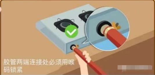 請使用專用燃?xì)饽z管,長度不超過2米、使用時間不得超過兩年、無老化破損的情況。膠管與氣瓶減壓閥、灶具、熱水器的接口處必須加裝管箍鎖緊,防止因膠管松動出現(xiàn)煤氣泄漏。