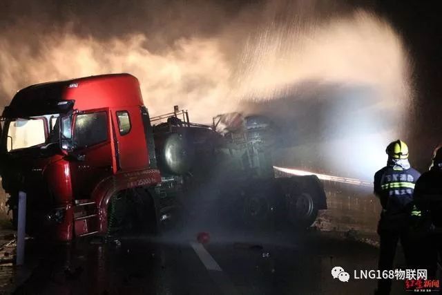 消防救援人員介紹,由于事故車輛為LNG(液化天然氣)動力,事故導(dǎo)致LNG氣罐閥門變形泄漏,且LNG儲存罐處于滿載狀態(tài),如發(fā)生爆炸燃燒后果不堪設(shè)想。根據(jù)現(xiàn)場情況,救援人員決定采取放空稀釋的方法進行處置。隨后,救援行動展開,一是高速交警立即對該路段進行封鎖,實施現(xiàn)場警戒;二是消防救援人員利用開花水槍、泡沫槍分別對氣罐泄漏點及周邊進行稀釋覆蓋,防止發(fā)生次生災(zāi)害。同時,救援人員調(diào)集大型吊車和裝載車對事故車輛進行起吊拖離。