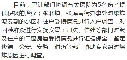 經(jīng)初步調(diào)查:此次事件疑似為天然氣泄漏遇明火發(fā)生爆炸,12號樓1單元共11戶,5人受傷,傷者均為302室,現(xiàn)分別在張家口和北京的醫(yī)院接受治療。目前均無生命危險,傷者和家屬情緒穩(wěn)定。