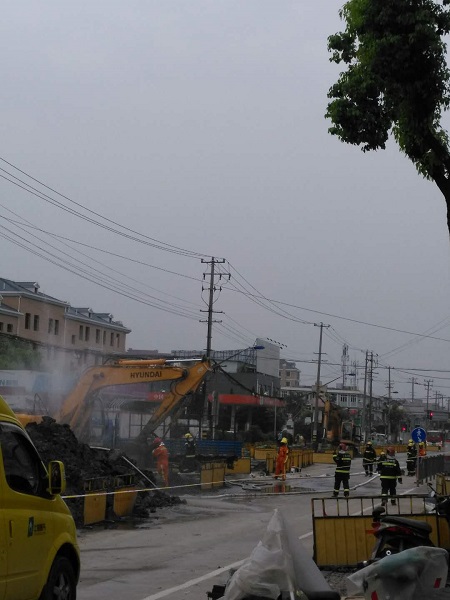 據(jù)附近市民介紹,近期,國(guó)權(quán)北路正在進(jìn)行道路施工。昨天下午,一臺(tái)挖掘機(jī)在作業(yè)時(shí),不慎將地下一根燃?xì)夤艿劳跀?,頓時(shí),大量氣體從管道內(nèi)噴出,空氣中還彌漫著一股濃烈的煤氣味。目擊者稱(chēng),管道被挖破后,現(xiàn)場(chǎng)噴出白色氣體,并不斷發(fā)出“嗤嗤”的聲音,工人們見(jiàn)狀,趕緊將挖掘機(jī)熄火。