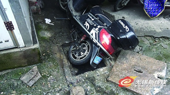 現(xiàn)場(chǎng)了解到,這次自行“跳躍”的窨井蓋數(shù)目不少,不過(guò)事故的動(dòng)靜不大,只有窨井蓋周圍有崩壞的痕跡,掉落下一些水泥塊,周圍并無(wú)燃燒跡象,也沒造成人員受傷。要說(shuō)最“嚴(yán)重”的,則是其中一個(gè)窨井旁停放的電動(dòng)車,被彈起的窨井蓋撞倒(見圖)。