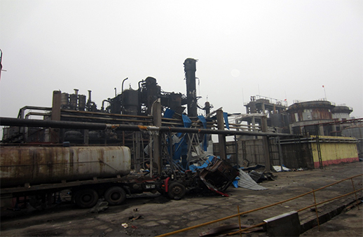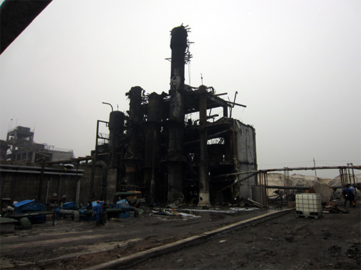 | 8月25日 | 18:46:22 | 氧化塔爆炸,并相繼引燃了氧化塔周邊氫化塔、萃取塔等設備中的物料。爆炸導致在四層平臺取樣的張某、一層北側(cè)檢查的秦某和程某當場死亡;并導致雙氧水車間南300米的氯堿車間氯氣管道受損,造成少量氯氣泄漏;爆炸碎片和泄露的氯氣導致雙氧水車間辦公室朱康康,中控室鄭某、金某、秦某,氯堿車間荊某、秦某和水泵房張某等7人受傷。 |
