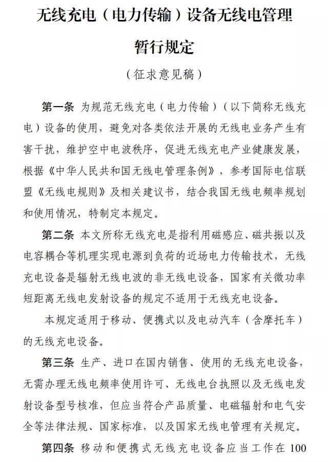 《無線充電(電力傳輸)設(shè)備無線電管理暫行規(guī)定》公開征求意見